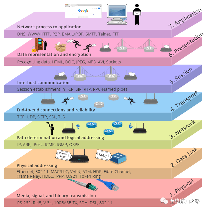 OSI七层协议的体系结构:应用层、表示层、会话层、运输层、网络层、数据链路层、物理层